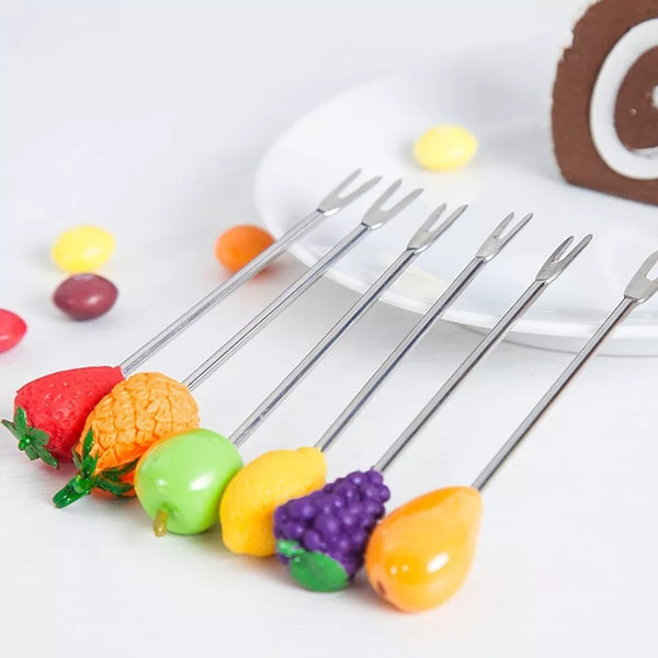 6 Pcs / Set Fruit Pattern Fruit Fork Snack Cake Dessert Food Fork Cute Creative Stainless Steel Party Decoration for Children.