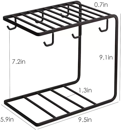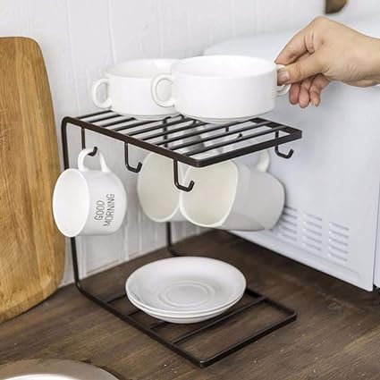 - [MULTIPLE VERTICAL MUG RACK] Metal mug cup holder with 6 hooks, fit for hanging 6 mugs for the hooks, organizer 4 cups, glasses, travel mug lids on the top rack and set a teapot, several small saucers, snack dishes on the bottom rack. Of course, you also used it as a small drying rack, display shelf.
