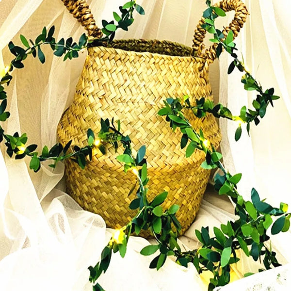 - A very delicate, green leaf string light garland! All along the garland is twisted a copper wire containing tiny LEDs in a warm white color, which make the garland appear to glow, can be bent to any shape you want, and add a beautiful decorative accent.