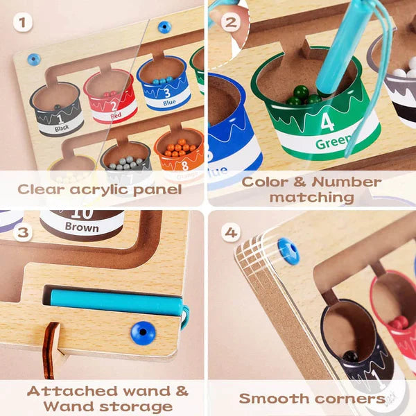 This magnetic board is not just a toy; it's a valuable educational tool. Children can use the magnetic wand to move the beads into the maze and sort them into the ten "coloring pots" representing numbers 1 to 10. The set includes 55 magnetic balls in ten bright colors, allowing children to practice counting and recognizing colors.