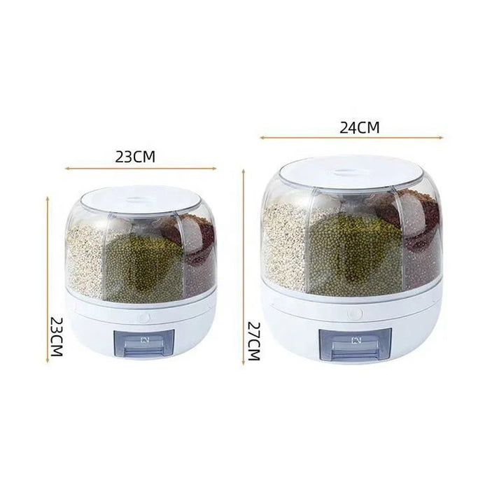 The Cereal Storage Box has strong sealing and can prevent moisture and dust. 6-Grid Rotating Grain Dispenser has a simple and elegant appearance. The key design is convenient to control and store whole grains such as rice, oat, mung bean, candy, and dry food.